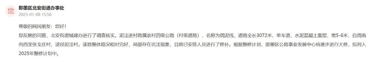 即墨区北安街道办事处答复:您反映的问题,北安街道城建办进行了调查核实。泥洼进村路属农村四级公路(村级道路),名称为周泥线,道路全长3072米,单车道,水泥混凝土面层,宽5-6米,自周南向西至张戈庄村,途径泥洼村。该路整体路况相对完好,局部存在坑洼现象,目前已安排人员进行了修补。根据整修计划,即墨区公路事业发展中心将逐步进行大修,拟列入2025年整修计划中。
